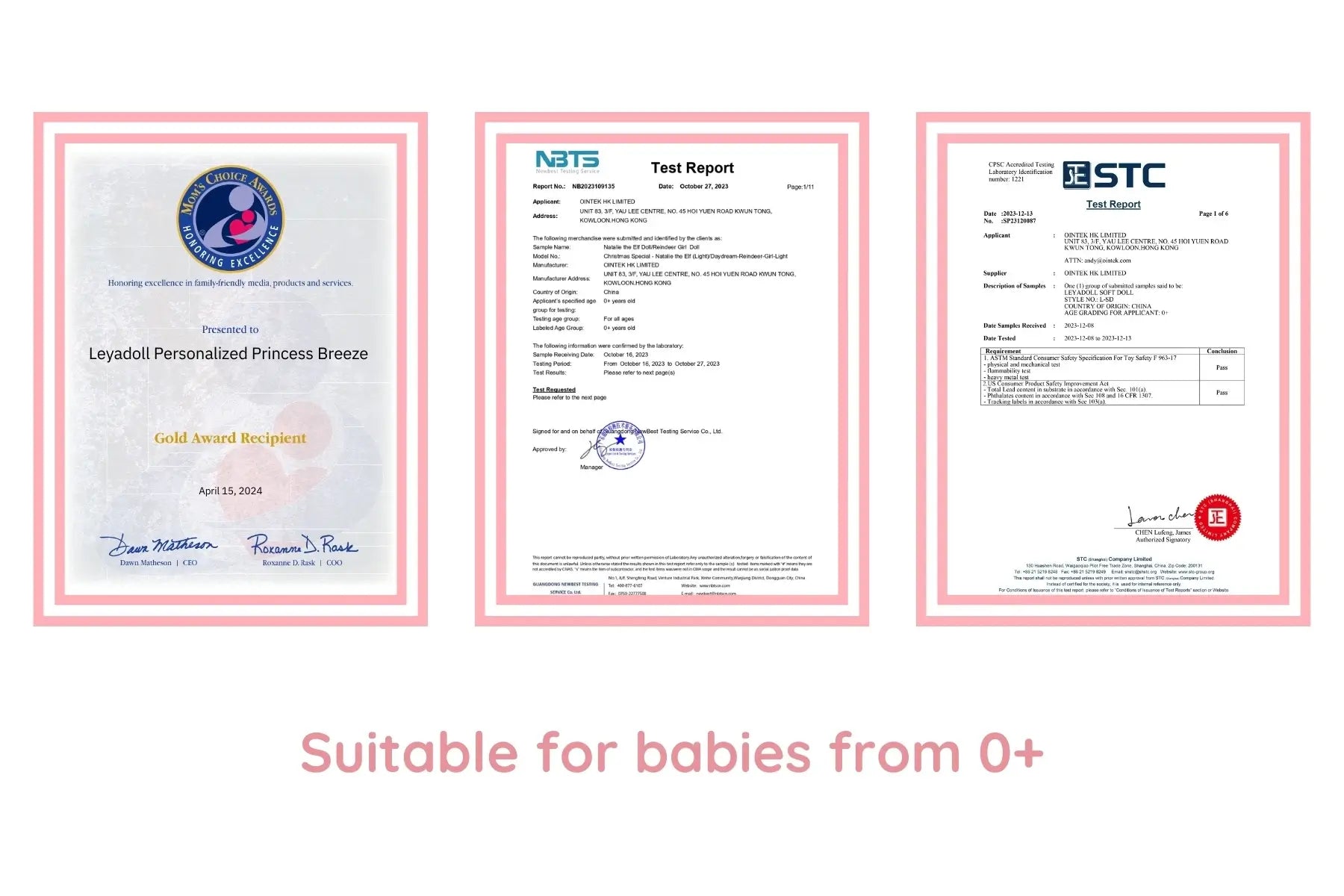 • Soft Book (19 cm × 19 cm, 2,54-5,08 cm dick, je nach Inhalt und Aktivitäten) mit abnehmbarer Little Leyadoll (12 cm hoch).