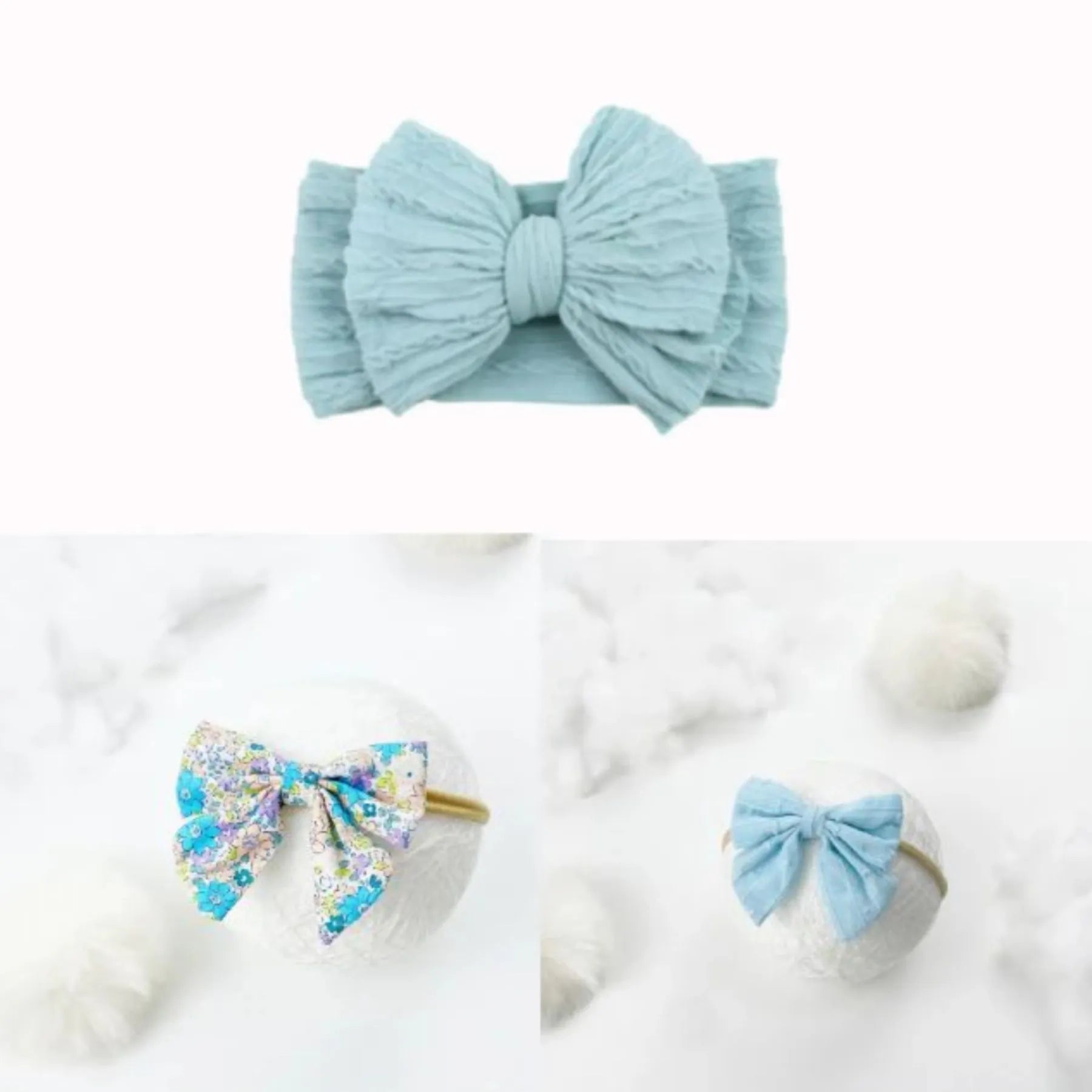 VARIETY OF STYLES - 3 different styles, colors, patterns included matching any outfit. The assortment of beautiful newborn hair bows includes Cotton Floral, Sakker, Silk Satin.