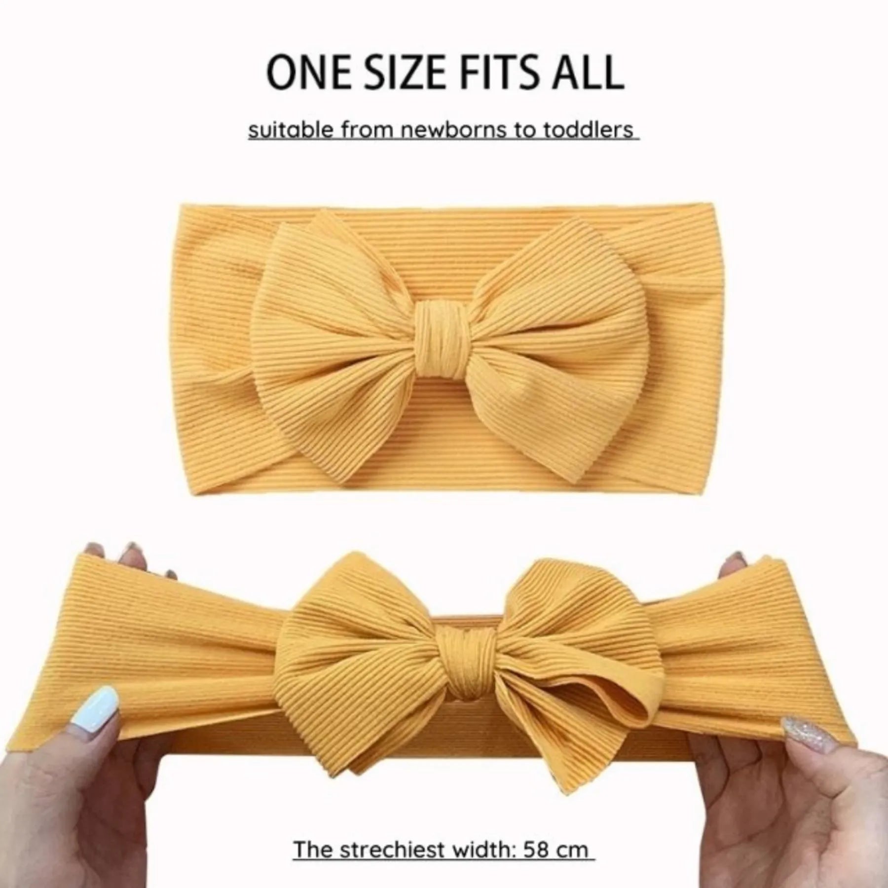 ADJUSTABLE TO GROW WITH YOUR BABY - "One size fits all"! Our bands can be hand stretched to best fit your child's head. The headbands are initially about 12-16 inches in circumference, small enough so that they won't slip off your little newborn's head. To prevent marks from forming on your growing baby's forehead, you can hand stretch the hairband to perfectly fit your baby!