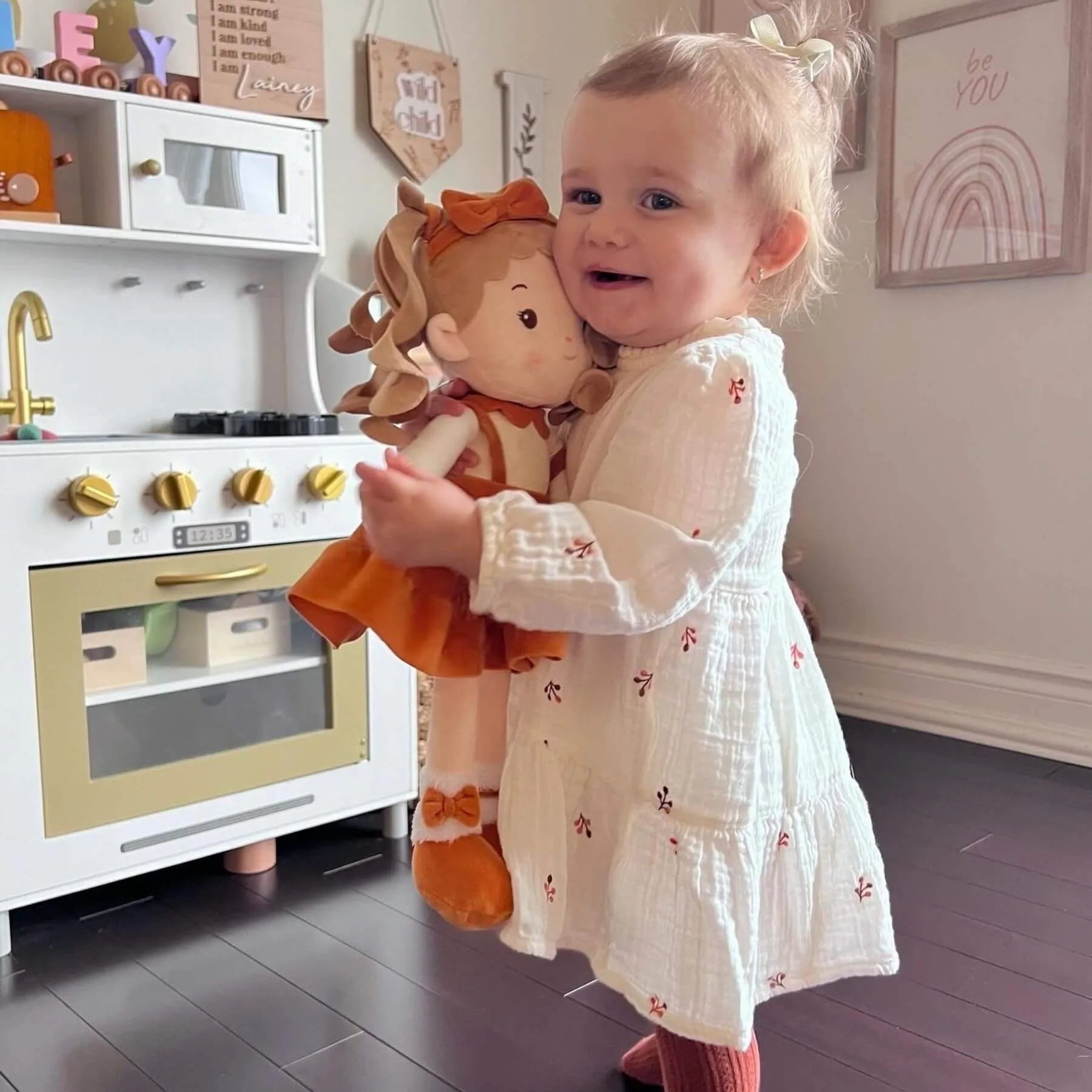 This was my 12 month old granddaughter's first doll and a Christmas present. She is quite short so the doll is almost s tall as her! It is adorable and the first thing she did was cuddle into it. The fabric is very soft, the facial expression makes you smile and the writing nice. The company was very good to deal with and very efficient.