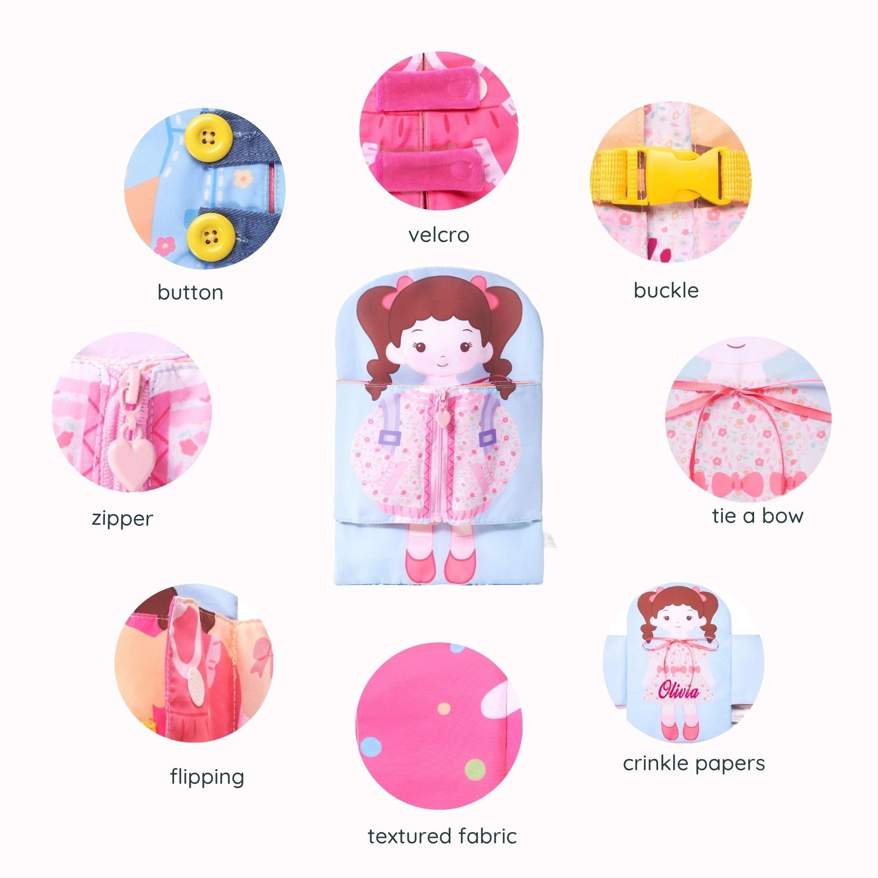 The Molly Knows How To Wear Soft Cloth Book features a variety of real-life fasteners like zippers, buttons, buckles, bow-tying, and velcros, it encourages practical dressing skills, fine motor development, and congnition through self-paced exploration. The Montessori approach promotes learning by doing, allowing your child to master everyday dressing tasks in an engaging and supportive way.