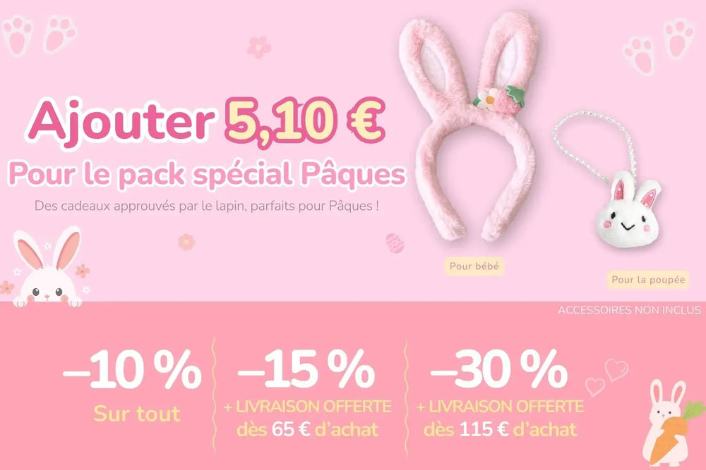 2. Votre colis Eggstra comprend un serre-tête lapin pour bébé fille, un mini sac pour poupée lapin et la livraison GRATUITE sur l'ensemble de votre commande.