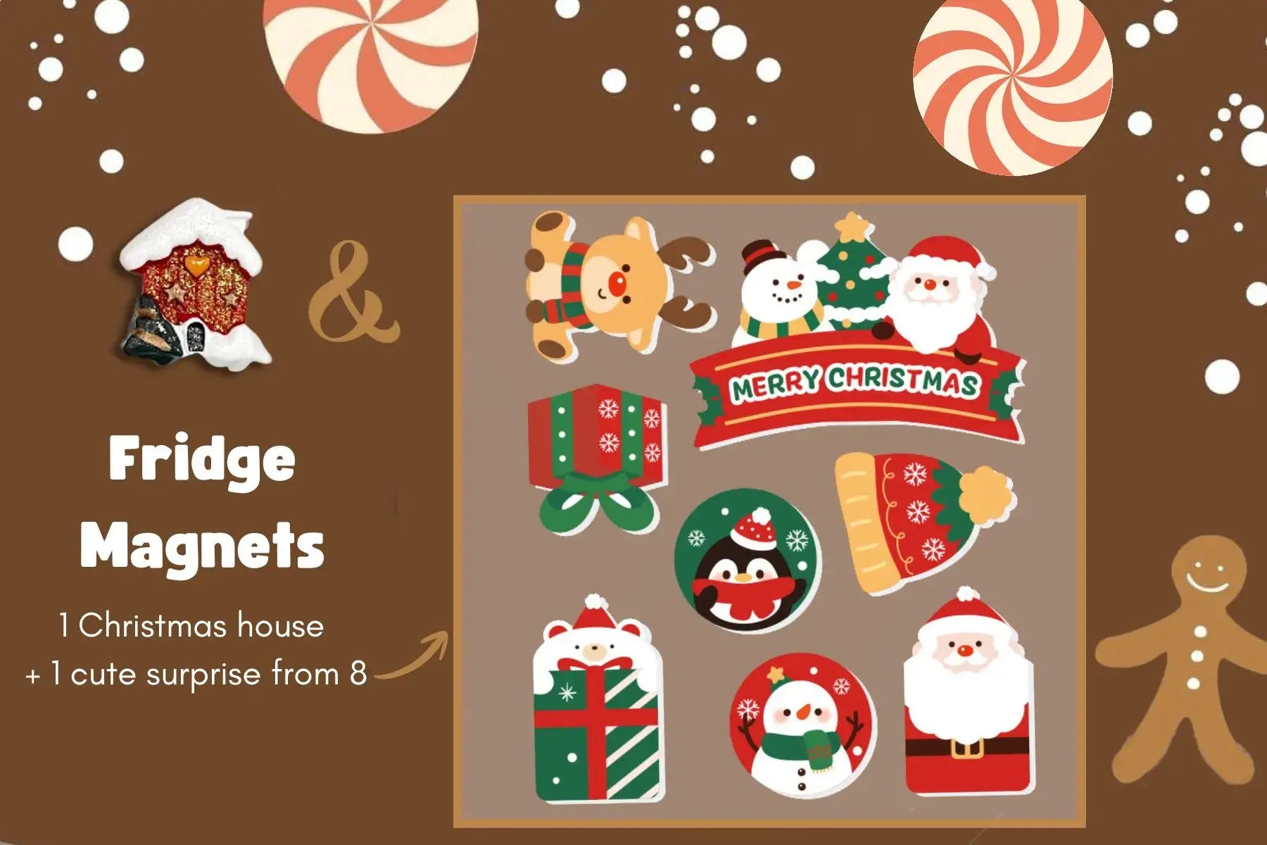 Complete your holiday decorating with sweet magnets. You’ll get one lovely Christmas house magnet as a fixed piece, along with a random cute pickfrom eight.