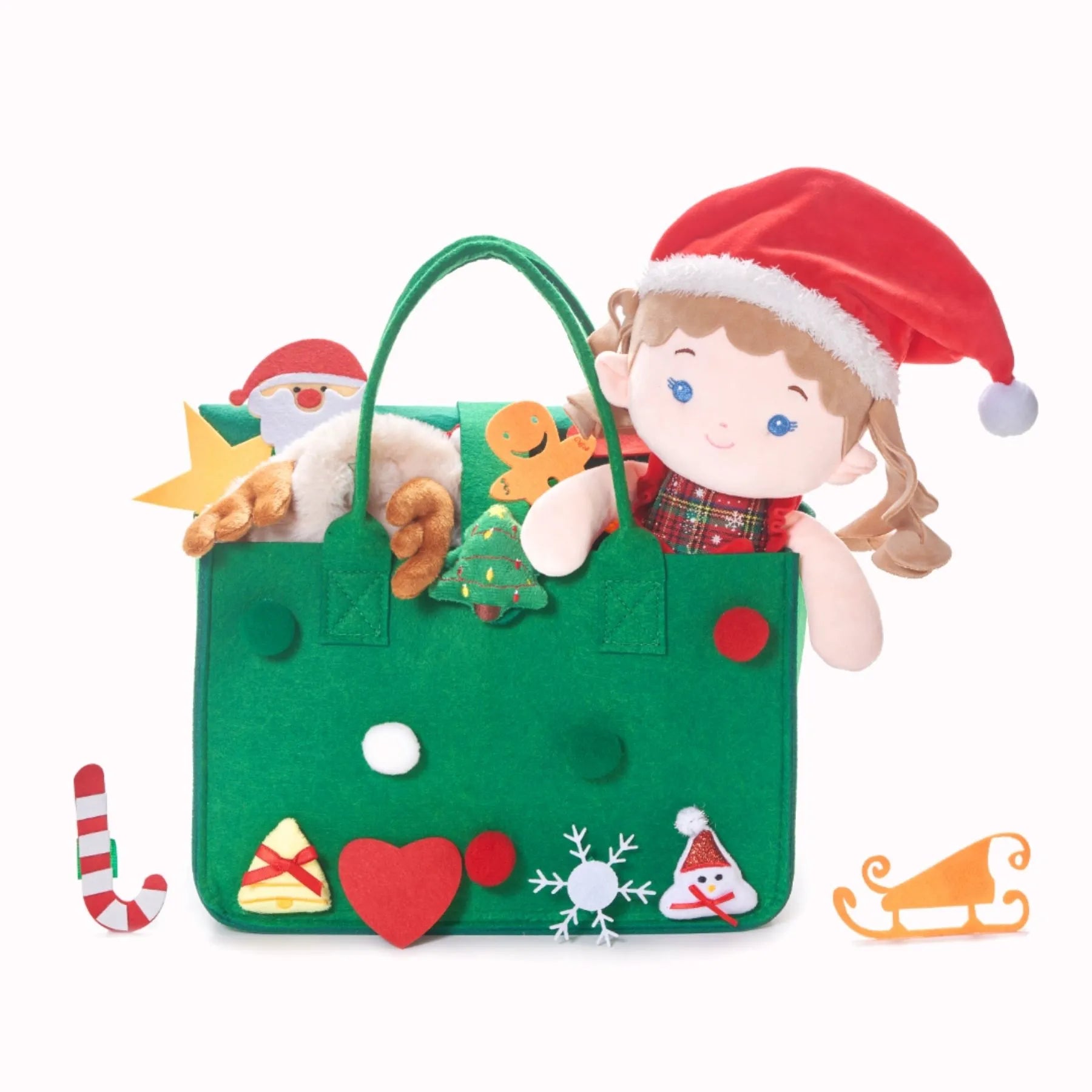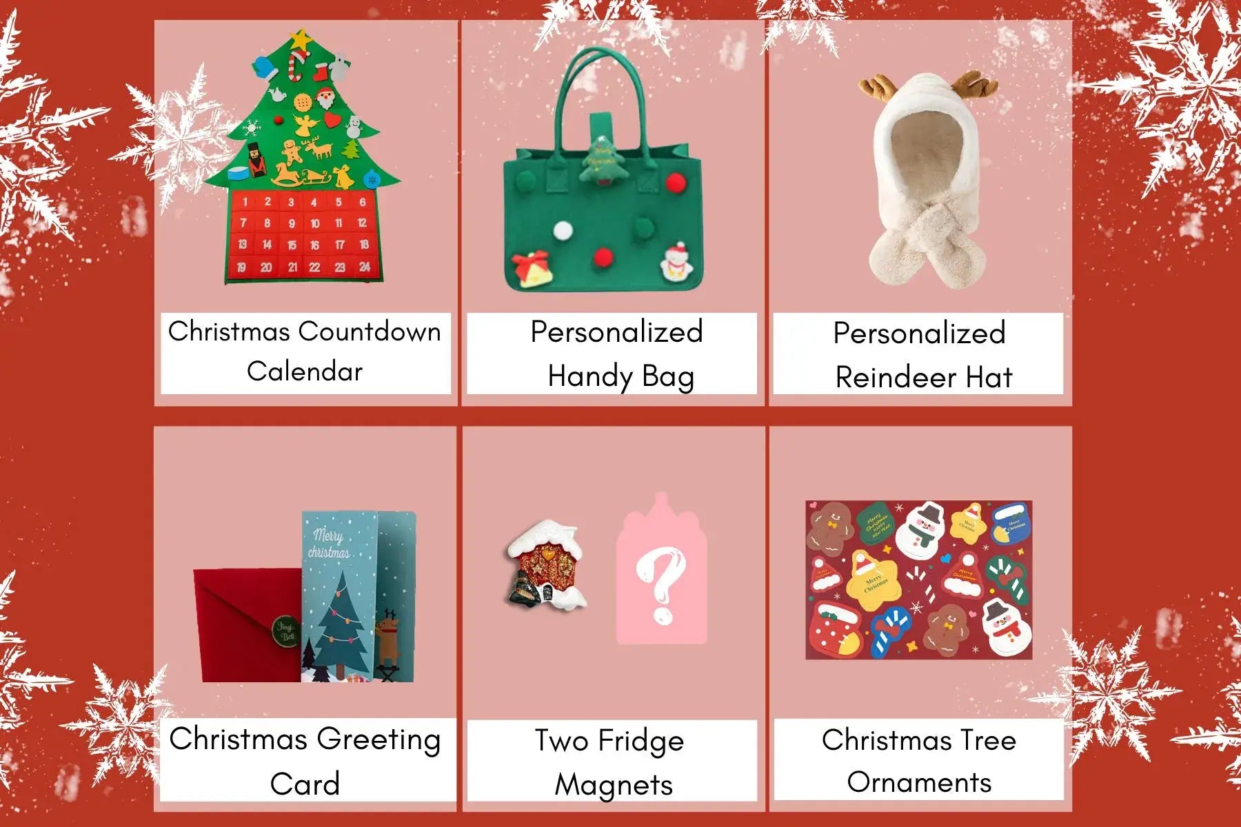 Personalized Christmas Gift Bundle with your baby's name. Get your baby's Christmas gifts done in only 1 click! Your baby's name takes center stage in this bundle, bringing you a bundle of joy that's unique and loveable. Inside this festive basket, you'll find: 1 personalized doll/stuffed animal, 1 Christmas Countdown Calendar, 1 Personalized Handy Bag, 1 Personalized Plush Reindeer Hat, 1 Christmas Greeting Card with a 3D feature, 1 set of Fridge Magnets(2pcs), 1 set of Christmas Tree Ornaments(14pcs).